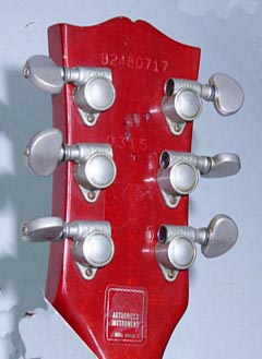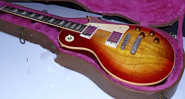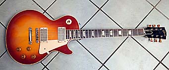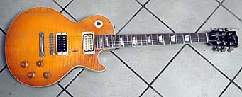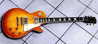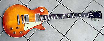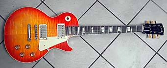 diverse signatur modeller. Gibson Les Paul Standard ”Sunburst” 1958 - 60 Kropp: En bit mahogny med karvad tvådelad Lönntop skarven alltid i centrum på gitarrkroppen, vit kantlist runt kroppen på ovansidan. Lönnlocken varierade, Plaintop = ingen figurering, Curly maple = Flammig lönn, Tiger stripe maple = Figureringen i Lönnen ser då ut som ränder som går tvärs över gitarren, Quilted Maple = Väldigt figurerad . Hals: En bit Mahogny, Brasiliansk Rosenträ greppbräda med vit kantlist, Les Paul signature på huvudet, svart/vit laminerad lucka över dragstången utan gravering. Mickar: 2 st Humbuckers. Stall: Tune-o-matic med stoptailpeice Plektrum skydd: Creme ett lager Färg: Cherry eller Tobacco sunburst. Det förekommer även få ex. som är Svart in till gul precis som en ES- 175 från den tiden. Betyg: Vad skall man säga om en gitarr som är så eftertraktad att den kostar mer än en sportstuga. Det är något magiskt med dom, det finns ingen gitarr som jag får sån feeling på som när jag lirar på Schaffers -59a Sunburst även fast halsen har varit ordentligt avslagen. Schaffers Sunburst har en cremefärgad P.A.F. mick i basläget, något som förkommer på gitarrer från -59. Den svarta plasten var slut så man använde cremefärgad i stället under en kortare period. Det finns mickar som har en svart och en creme färgad spole också dessa kallas för Sebror. Dessa mickar höjer värdet på gitarren och är väldigt högt värderade. -58or och -59or är mest eftertraktade i USA eftersom dom har fetare halsar och låter lite fetare. Personligen så tycker jag att -60orna är bäst. Halsfigurationen som Gibson hade 60 - 62 är min favorit. Tunn och platt vilket gör att halsen känns lite bredare. Nedan några exempel på hur olika dom kan se ut.