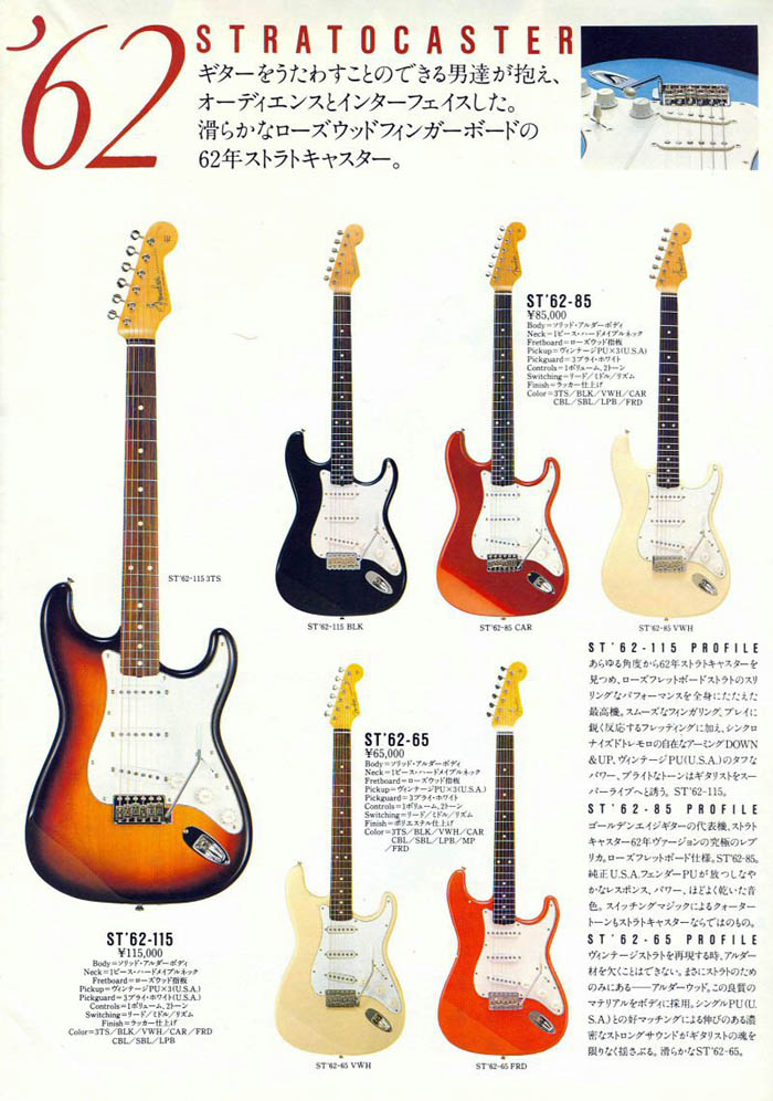 En nitrocellulosa lackad Fender JV "62 Stratocaster med al kropp och Pick Up Made In USA "klistermärke (precis som på export Squiers). 85 och 115 "modellerna var lackade med nitrocellulosa, och" 65-modellen med polyuretan. Kropparna var gjorda av al eller ask. Dessa gitarrer hade en större Fender dekal med "Made in Japan" tryckt under Fenderlogon denna stora dekal minus den ursprungliga Contour Body dekalen användes under en mycket kort tid 1982. Ett stål block var också montera på stallet på Fender 115 modeller.