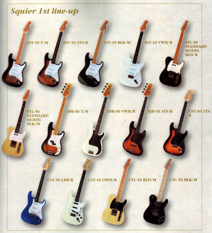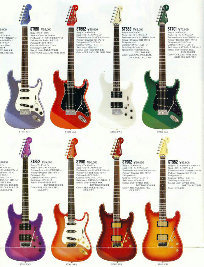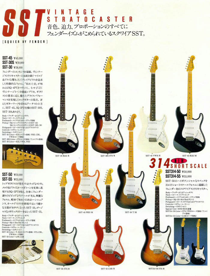 These are the colours and pickup specs for all SST models througout the domestic Squier JV period: (these can be seen in the catalogue further down the page). Dessa är de färger och pickup specs för alla SST modeller througout den inhemska Squier JV: (dessa kan ses i katalogen längre ner på sidan).