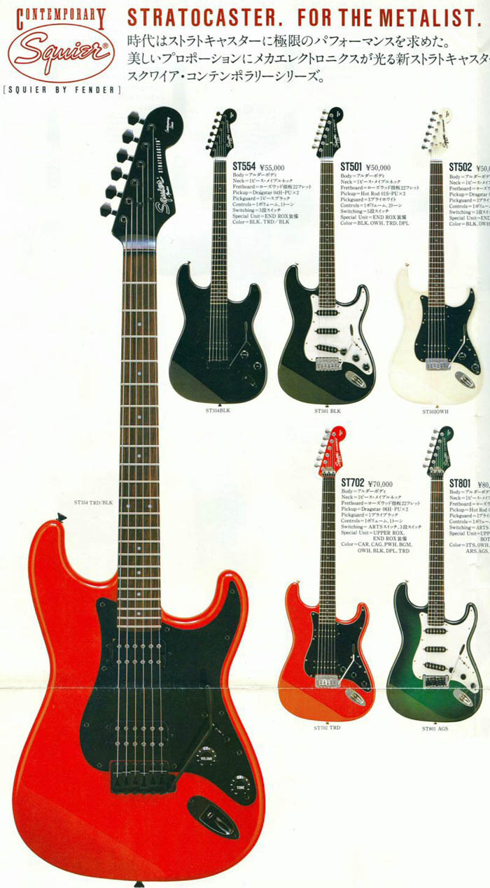 Ännu en kandidat för JV Squier blev första versioneerna av Contemporary Serien. Dessa modeller infördes i slutet av 1983 med JV serienummer. Contemporary serien ansågs som en del av den andra etappen av Fender Squier Japan (Det fanns inte mindre än 13 olika modeller i denna serie). Gitarrerna hade s.k matching headstocks. Se katalogblad längre ner på sidan. Som du ser på bilderna nedan så är det inte den typ av gitarr man förväntar sej ha JV serienummer. Även Telecastern fanns iContemporary Serien. Även om de är bra gitarrer i sig , så är dom trots sina JV serienummer inte något för JV entusiaster och samlare.