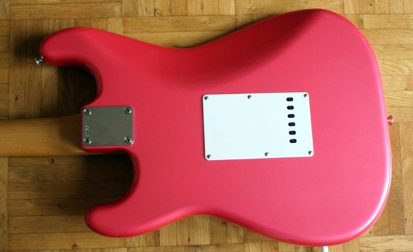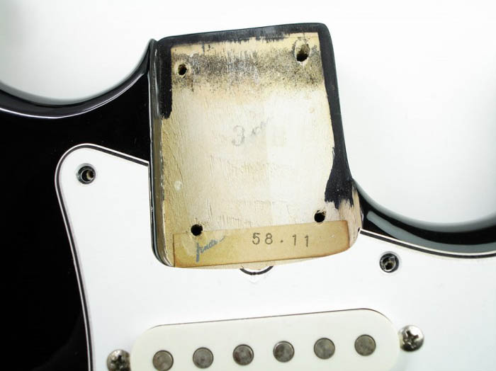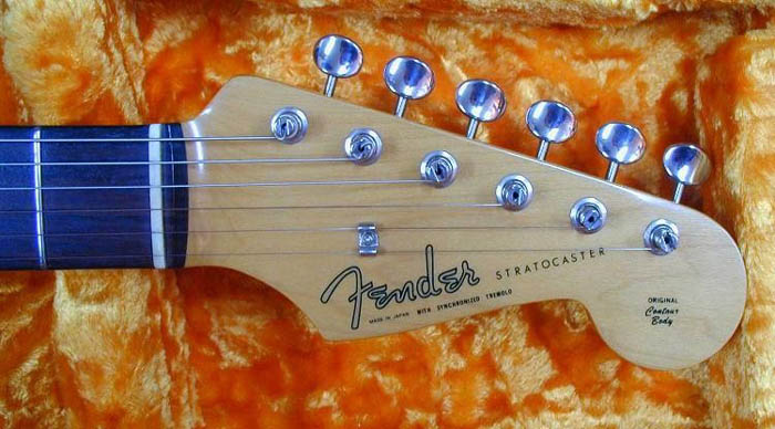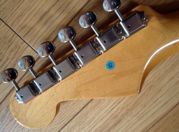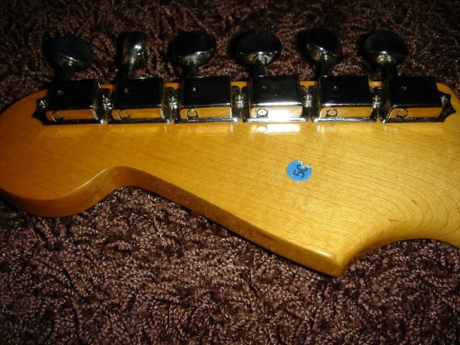Ovan: Stratocasterns halsficka med den röda "D stämpeln som anger att det är ett Domestic instrument avsett för Japanska återförsäljare. Det förkommer att halsarna på domestic gitarrer kan ha export stämpeln EX eller EXT.