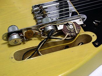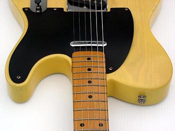 Ovan: Några närmare bilder av TL'52-95 kroppen nitrocellulosans yta och svart fiber bakelit plektrumskydd.