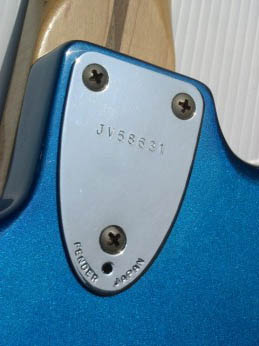 Tags från ett tidigt Stratocaster (modell 115). Det blå klistermärket med modelkod fanns på alla inhemska JV modeller men sitter sällan kvar idag.