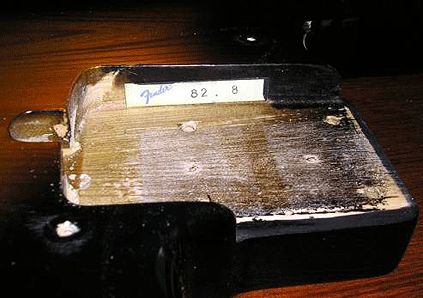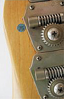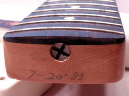 Fräsningen för volym och tone kontroll , till höger är en bild av baksidan av huvudet som visar dom tidiga omvända stämskruvarna med mindre Phillips skruvar än på senare versioner.