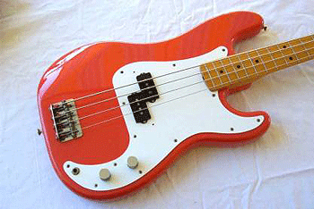 Bilden ovan till vänster: Huvudet på en Squier "62 vintage Precision Bass med hangtag, och till höger, en fiesta röd" 57 modell (JV59634)
