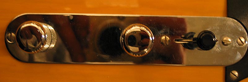 Bild vänster: Tyg kablar lödda på DM-30 switchen 2 st 250 K potar och en 0.23uF kondensator man använde även kondensatorer på 0,1uF notera kontroll plattan med Dome rattar och den speciela switch knoppen som bara satt på Telecastern .